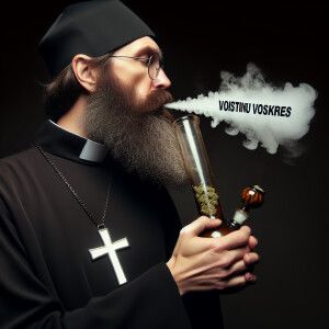«мужчина в рясе с бородой, курящий бонг, а в виде дыма написано “...»