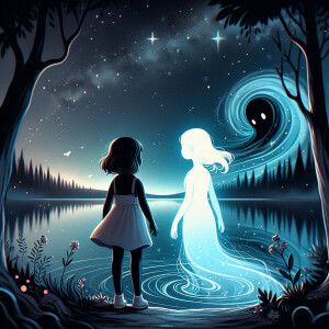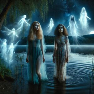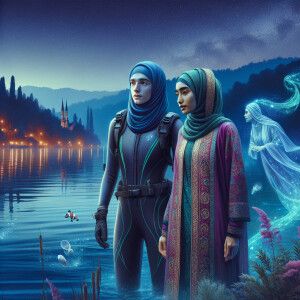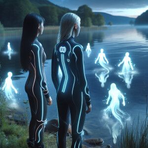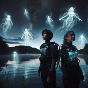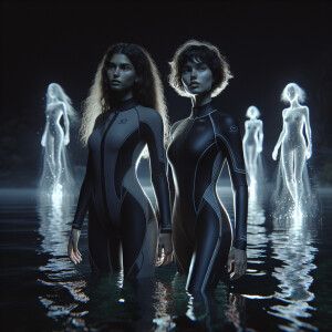 «Two girls are standing near the lake at night in a hydro suit an...»