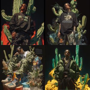 «"Travis Scott surrounded by Green cactus wearing brown Jordan’s...»
