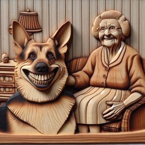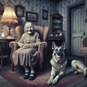 «Whimsical old lady sitting in her living room. Her grrman Sheph...»
