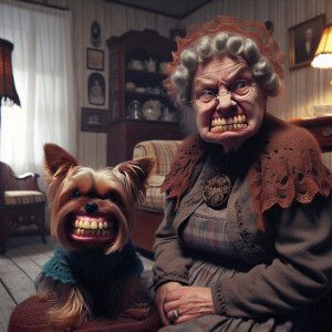 «Whimsical old lady sitting in her living room. Her expression s...»