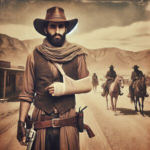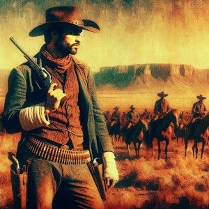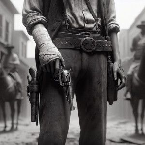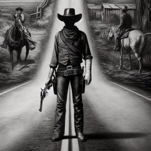 «An old west cowboy standing in the middle of the road, six shoot...»