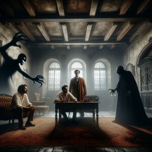 «Two men and one woman are in a creepy old room, and a lot of evi...»