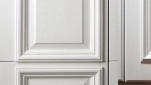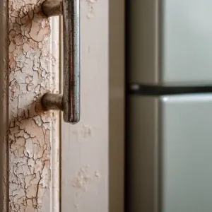 «Photograph a single kitchen cabinet door close-up, showing sligh...»