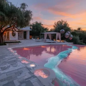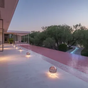 «Paint a vivid scene of a luxurious mansion's rear terrace at dus...»
