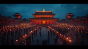 «A hyper-realistic, wide-angle 16:9 cinematic shot of a grand tem...»