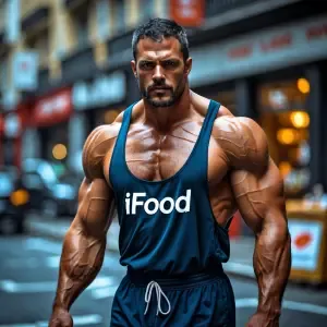 «Cria uma imagem de um entregador de ifood corpo monstruosamente...»
