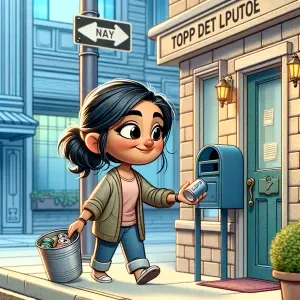 «A cartoon person finds a can on the ground and walks to the post...»