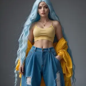 «Create an image of a lady with this face wearing a blue baggy je...»