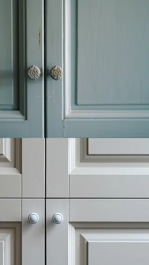 «Capture a detailed close-up of aged kitchen cabinets showing gre...»