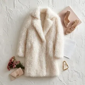 «Create a Fluffy white faux fur coat with oversized lapels, soft...»
