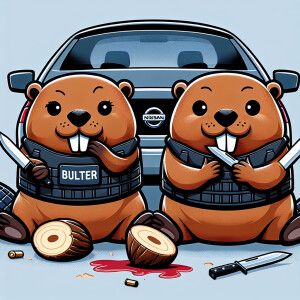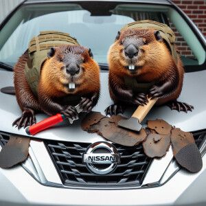 «Милые бобры сидят и грызут автомобиль ниссан с ножами в лапах и...»