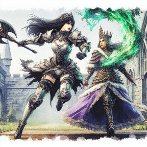 «create a photo of Snow White in battle armor running towards the...»