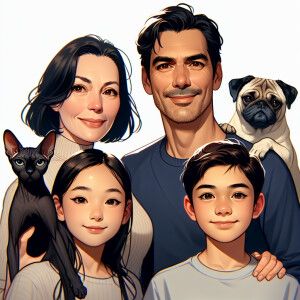 «Семейный портрет 4 человека, черная кошка сфинкс и мопс.