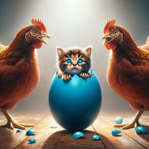 «3 brown chickens look with frightened eyes at a blue egg from wh...»
