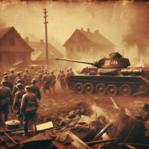 «IS-2 tank with red army soldiers around in burnt european villag...»