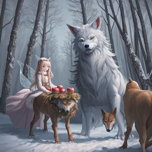 «Draw a fairy tale in a winter Russian forest with apples and wol...»