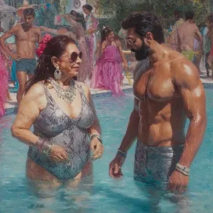 «a punjabi curvy mother in law, in her late 50s, wearing latex...»