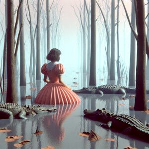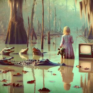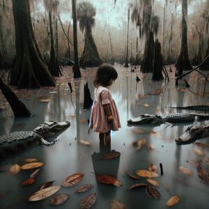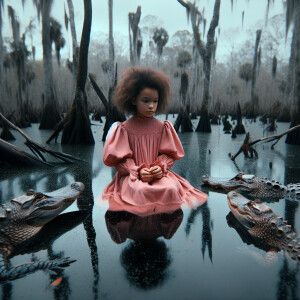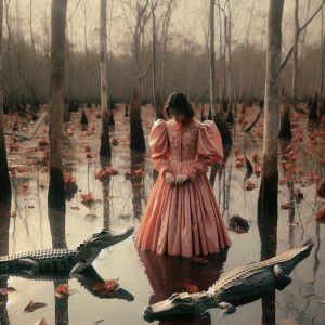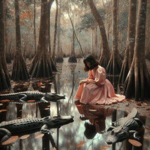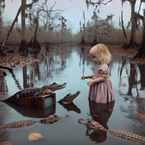 «a girl in close proximity to three alligators in a Louisiana swa...»