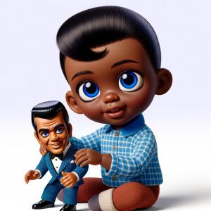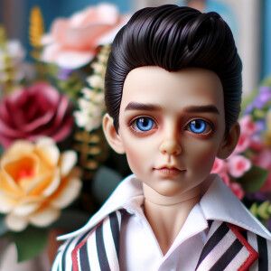 «Elvis Presley doll with huge blue eyes flowers in the background»