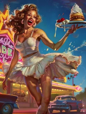 «1950s retro pin-up illustration, glamorous roller-skate waitress...»