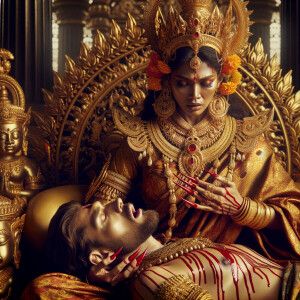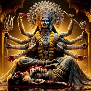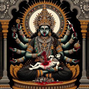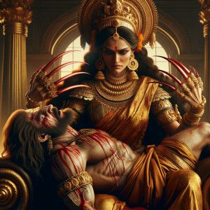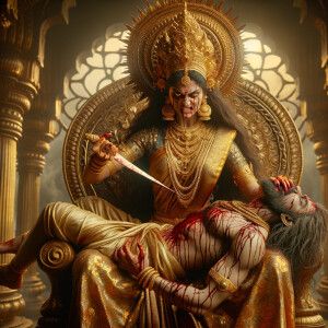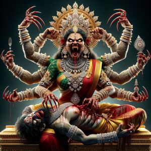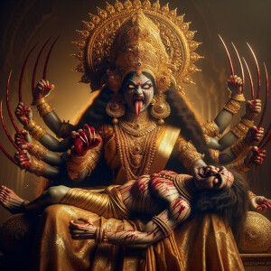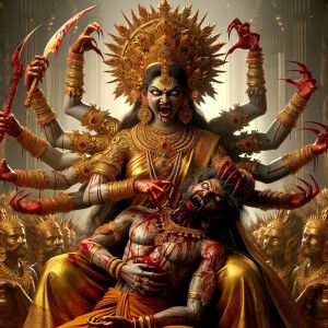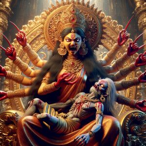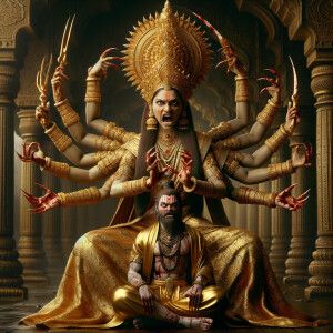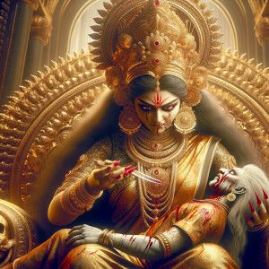 «portrait of angry looking indian goddess sitting on a gold crown...»