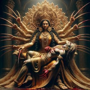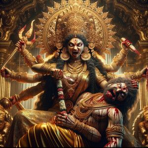«photograph of angry looking goddess durga sitting on a gold crow...»
