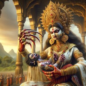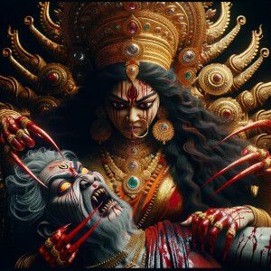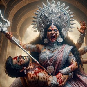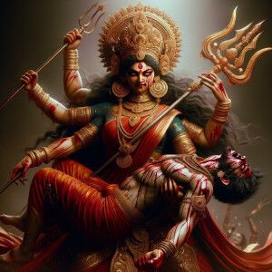 «portrait of angry looking goddess durga carrying a weak mahisha...»