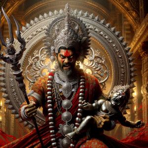 «portrait of angry looking goddess durga carrying a unfit mahish...»