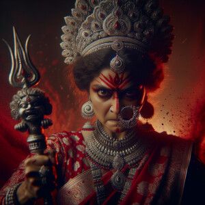 «portrait of angry looking goddess durga cosplayer carrying a ma...»