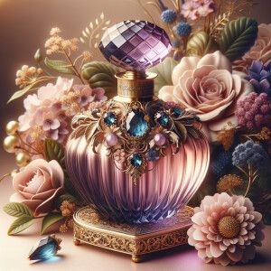 «Design an exquisite vintage perfume bottle with a lavender-hued...»