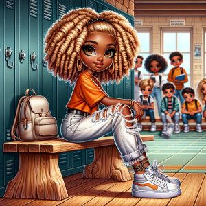 «Chibi Full body, African American sitting on a rustic bench. She...»