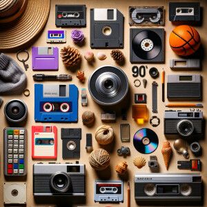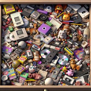 «A cluttered over filled junk drawer with 90’s memorabilia inspir...»