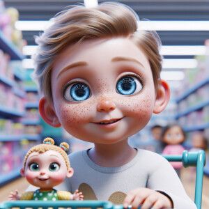 «Create a 3-D realistic image of a little girl with large blue ey...»