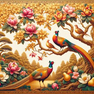 «A gold-leaf painting of flowers and birds, with birds standing o...»
