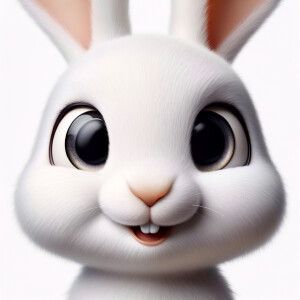 «Macro shot of a cartoon rabbits face, white fur, fun and energet...»