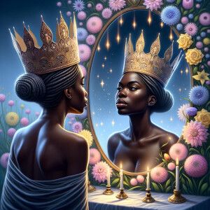 «An African-American woman stands before a mirror, her gaze intro...»