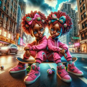 «Two caricature character sisters ink wash art sitting on a skate...»