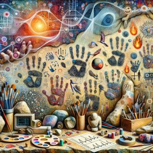 «Cave Art with Handprints symbols for fire, water and air, macro,...»