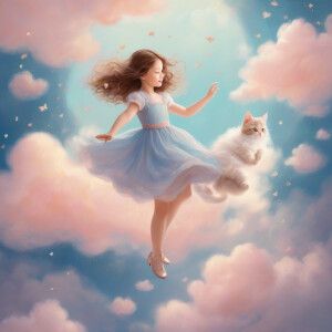 «Create a dreamy illustration of a girl floating on top of the cl...»