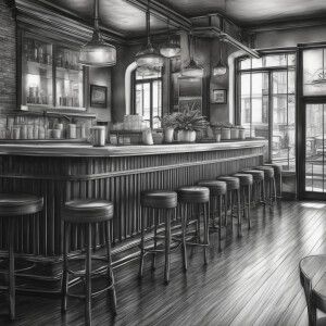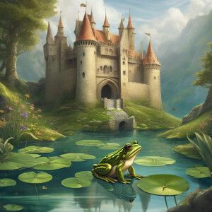 «Create a mythical illustration of a frog in a pond, looking down...»