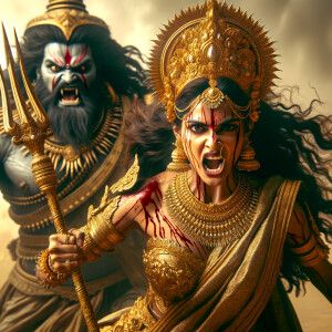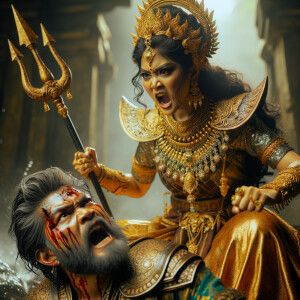«portrait of angry looking, indian goddess lunging at a weak mahi...»