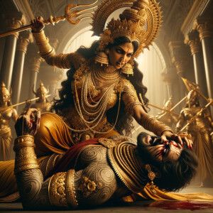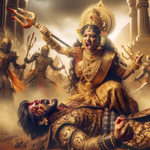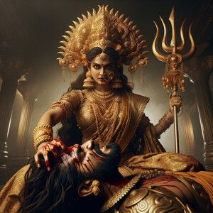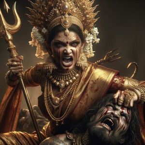 «portrait of angry looking, indian goddess trampling a defeated m...»