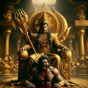 «portrait of angry looking tall goddess durga sitting on a gold c...»