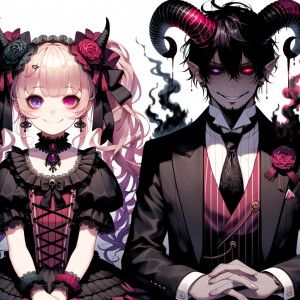 «A girl named lilith with elegant gothic lolita dress sit beside...»