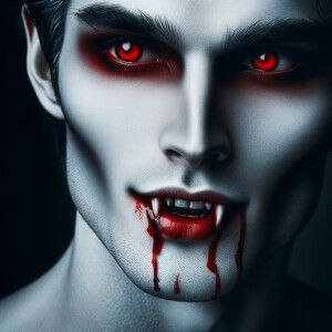 «Male vampire red eyes fangs dripping with blood»