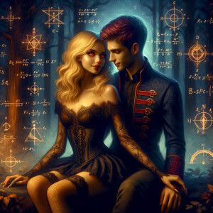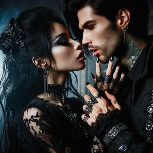 «A beautiful goth woman lips kissing with a handsome goth man, em...»