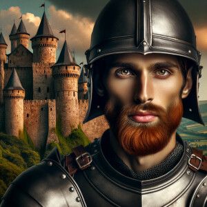 «A Knight with his helmet off. He is 30 years old with red hair a...»