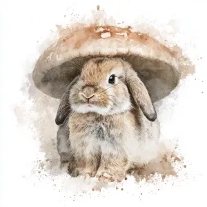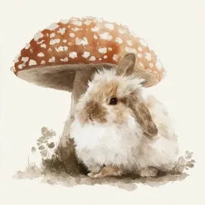 «Soft fluffy rabbit under spotted mushroom, gentle watercolor tex...»