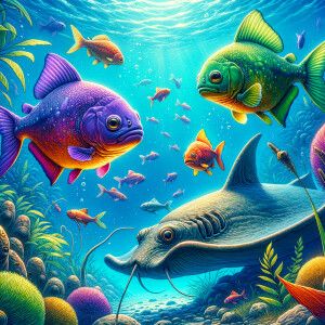 «Purple lime piranha no teeth swimming with a blue marlin»